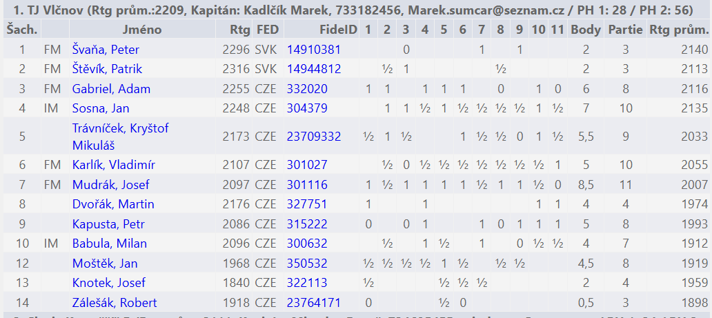 Kýženou postupovou polovinu bodu zajistil Trávníček. Po přestálé časové tísni vynutil na třetí desce s Hložkem Michalem remízu z pozice síly; v jezdcové koncovce má pěšce více, zřejmě těžko realizovatelného.
