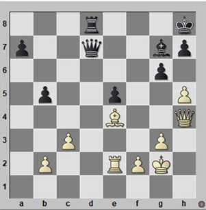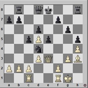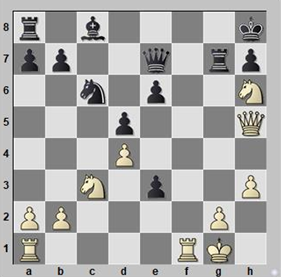 Po 21.Vf7 Vg5 Ani 21…Vxf7 22.Jxf7+ Kg8 není lepší, 23.Vf1 a černý král útok tří figur B nepřežije. 22.Vf8+?? Záchrana pro Č. Logický ústup 22.De2 Dd8 23.Vaf1 Sd7 24.V1f6 naději Č nedává. 22…Dxf8 23.Jf7+ Kg8 24.Jh6+ a remíza věčným šachem.